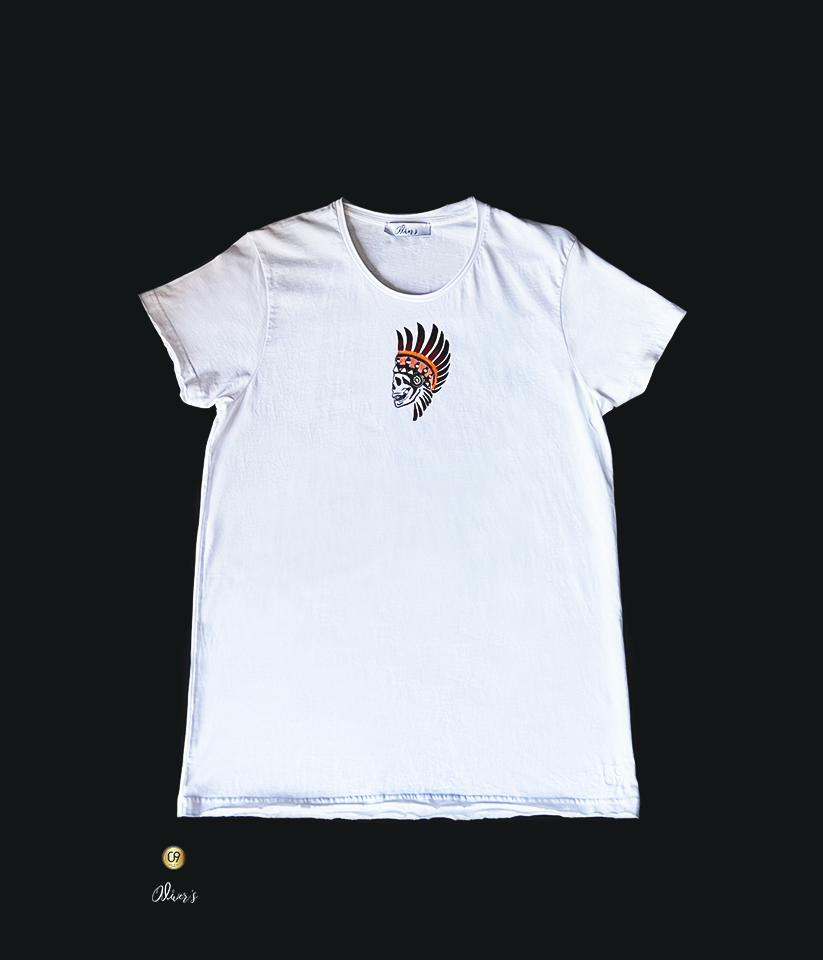 O9iver’s presenta la nuova linea t-shirt Custom™. In questa nuova versione della nostra iconica t-shirt CHRIS è stata dipinta a mano, sul centro del petto, una reinterpretazione di un teschio con un copricapo cherokee.